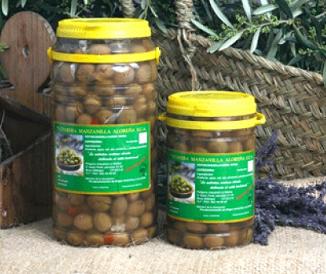 El producto: Aceituna Aloreña partía de hueso flotante (la carne despega totalmente del hueso), carnosa y dulce. Destacan su elaboración natural, sin aditivos químicos, se conserva con salmuera de manantial natural de sierra nevada; elaborada con el aliño de plantas aromáticas de la zona, rica en fibra posee además propiedades antioxidantes naturales que le confieren en la piel un efecto antienvejecimiento. Envase: Garrafa de 1